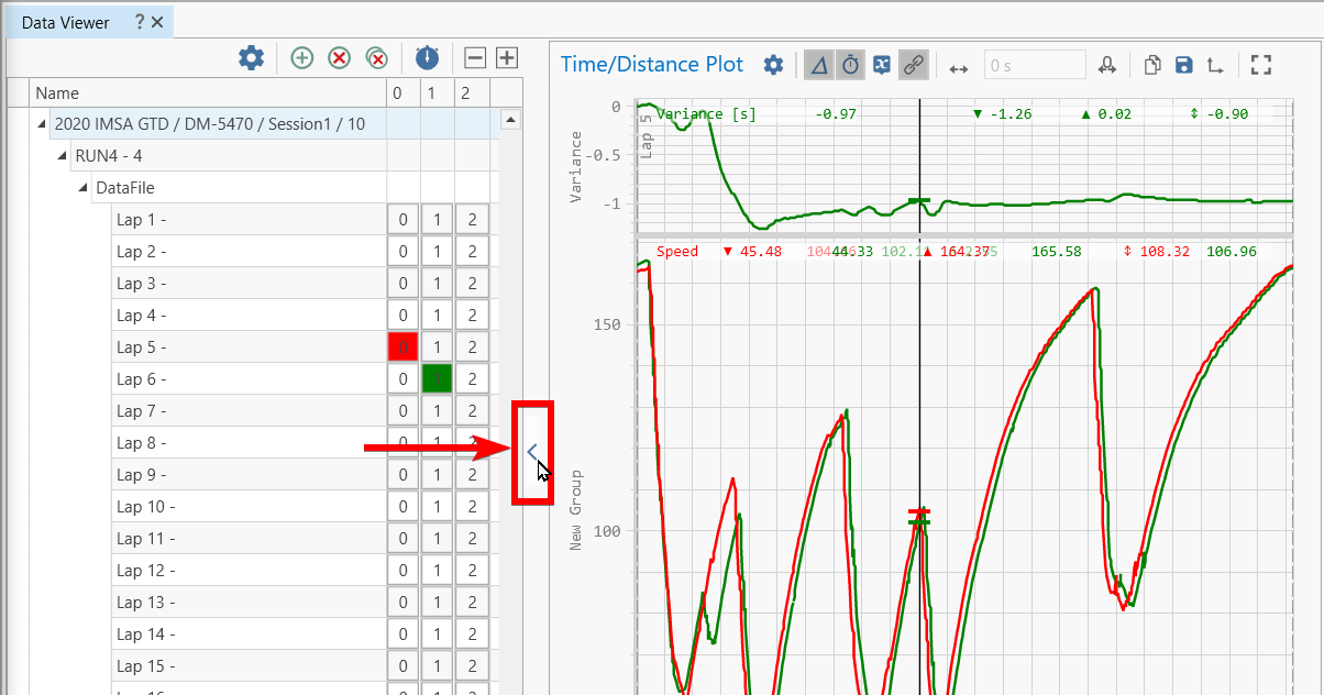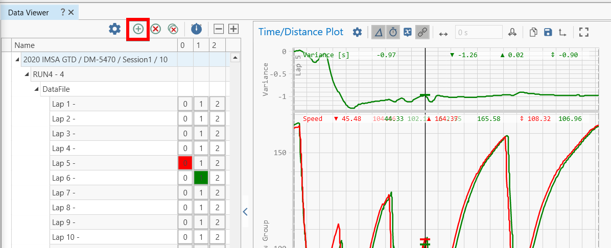 The File Tree panel on the left of side of the Data Viewer shows the opened files. This control allows the user to select which laps will be shown in the plots on the right side of the Data Viewer.