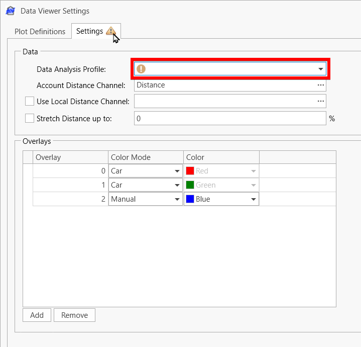 The Plot Definitions tab allows the user to add, edit, or remove the plots that appear on the Data Viewer screen.