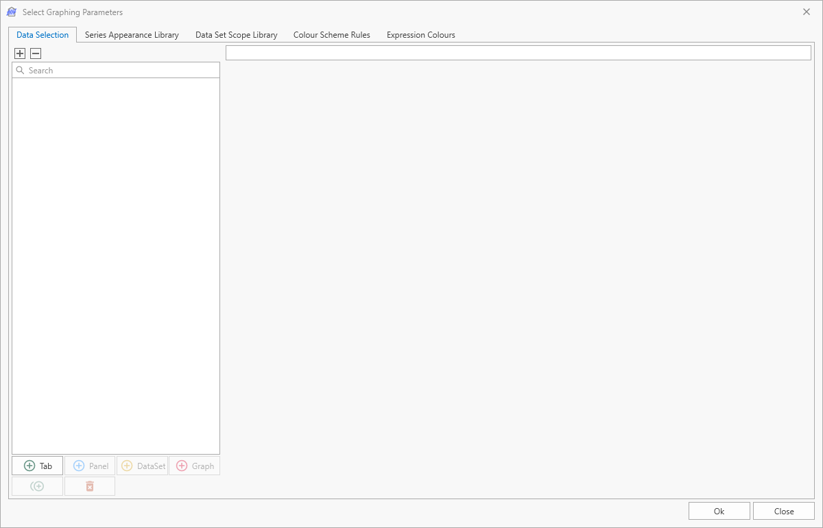 The data selection tab is where the graph is constructed, and the items from the data set scope and series appearance libraries are used. There are three levels to manage when building a graph: