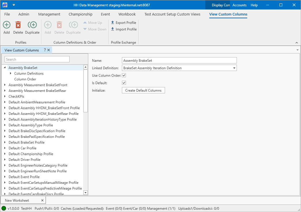 The column profile defines the definition that the column profile is linked to. This is how the column profiles are linked to different parts of the software. For example, a profile linked to the tyre set definition would be used to define the columns shown in the tyre sets view. If there are multiple custom column profiles linked to a specific definition, the Is Default checkbox is used to select which custom column profile will be used in the default views in HH Data Management.