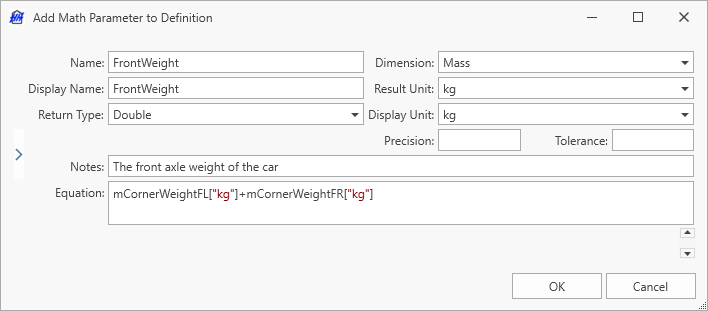 When creating a math parameter the input properties are similar to for a standard parameter. If the return type is double then the dimension and result and display units can be set. The result unit defines the expected output of the expression that is defined, and the display unit is the unit that the result will be displayed in the user interface of the software (or returned from the API).