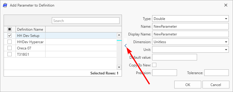 When adding parameters to a definition the pop-up window contains of two parts. The left part is optional and not always visible, and the right part is mandatory and lets the user configure the new parameter through the previously mentioned settings. The left part can be made visible when there are multiple definitions of the same definition type. For example like for setups or parts. It helps the user to add the same parameter to all selected definitions at the same time. This is particularly interesting for mileage related entities like Part Items, Assembly Iterations, Measurements etc.