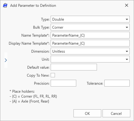 The bulk type can have the value of Corner or Axle. If Corner is selected, four parameters will be created and if Axles is selected two parameters will be created. Going back to the camber example if you enter Camber{C} and select the bulk type then four new parameters will be created CamberFL, CamberFR, CamberRL and CamberRR.