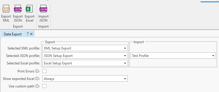 The Data Ex-/Import view makes use of the Global Filter. Once the filter is defined, the profile can be selected and the appropriate button clicked on the ribbon bar to run the export: