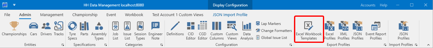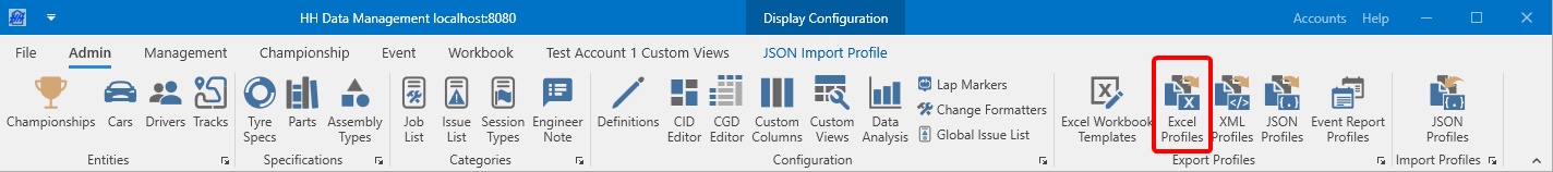 The Excel export profiles can be accessed on the Admin tab of the ribbon bar