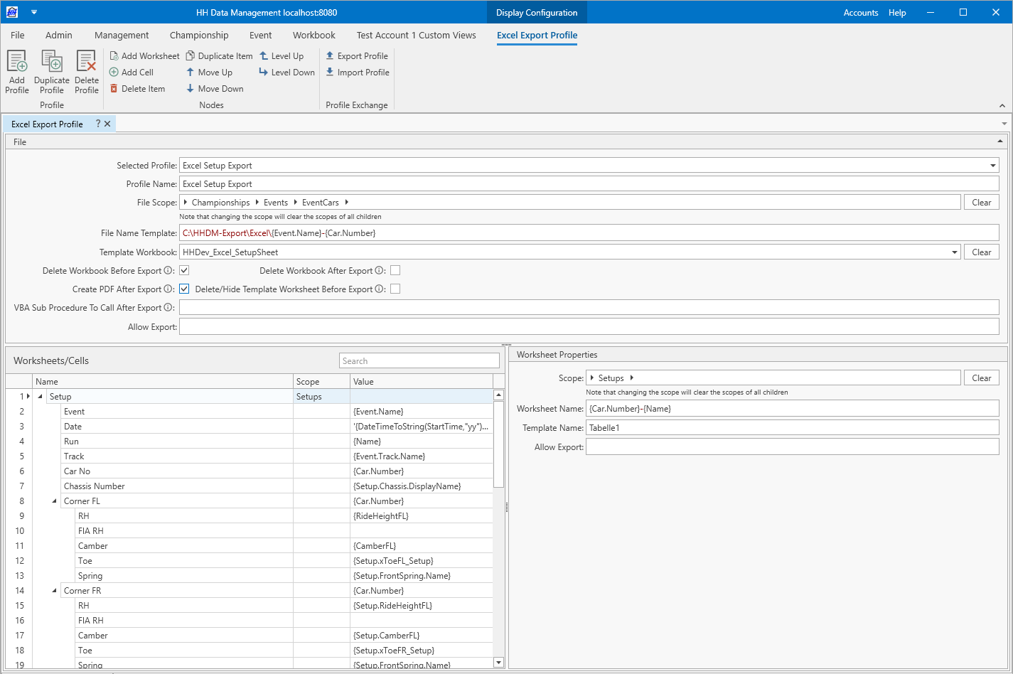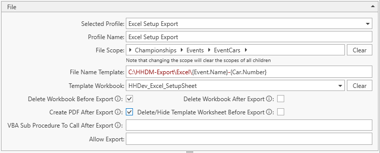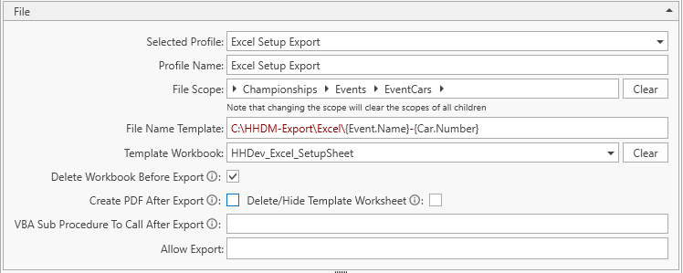 In this current example, the File Scope is Championships → Events → EventsCars. This means that a new file will be created for each car in each event that is selected for export.