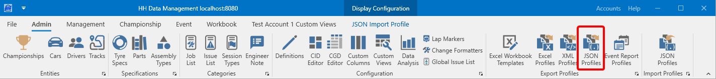 The JSON export profiles can be accessed on the Admin tab of the ribbon bar