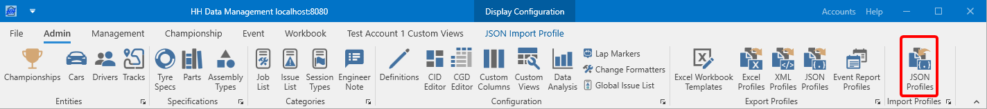 The JSON import profiles can be accessed on the Admin tab of the ribbon bar