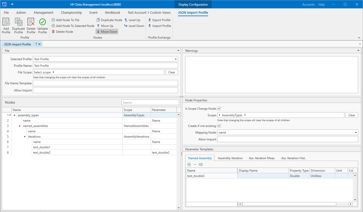 - File Scope: defines the root scope. For imports this field will often stay empty. If you have for example 5 assembly types that should get imported and those 5 assembly types are defined in one JSON file, then the file scope will stay empty and the first node in the tree should have its scope set to "AssemblyTypes". However if each assembly type is defined in its own JSON file, then the file scope needs to get set to "AssemblyTypes". The correct selection of the file scope depends on the JSON file.