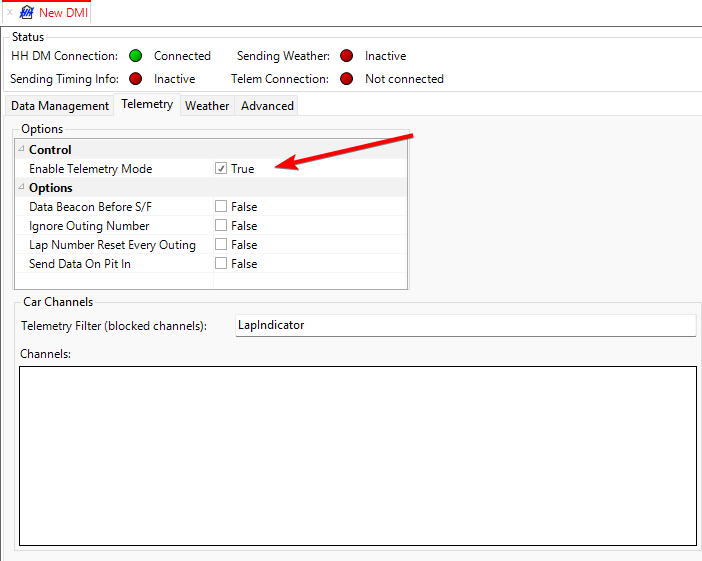 The DMI allows filtering channels. This allows reusing a Telemetry reader configuration while filtering the channels that are sent to Data Management. For example, the LapIndicator channel is used for calculations in the Telemetry Reader and it should be included in the list of blocked channels.