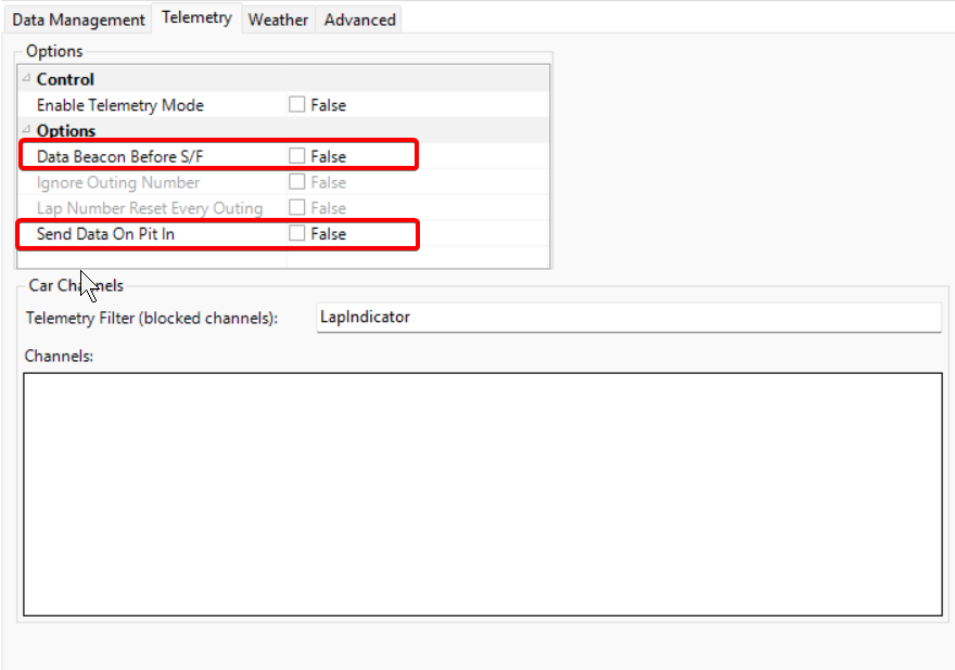 Refer to the Telemetry additional options section for details on the Data Beacon Before S/F and Send Data On Pit In parameters.
