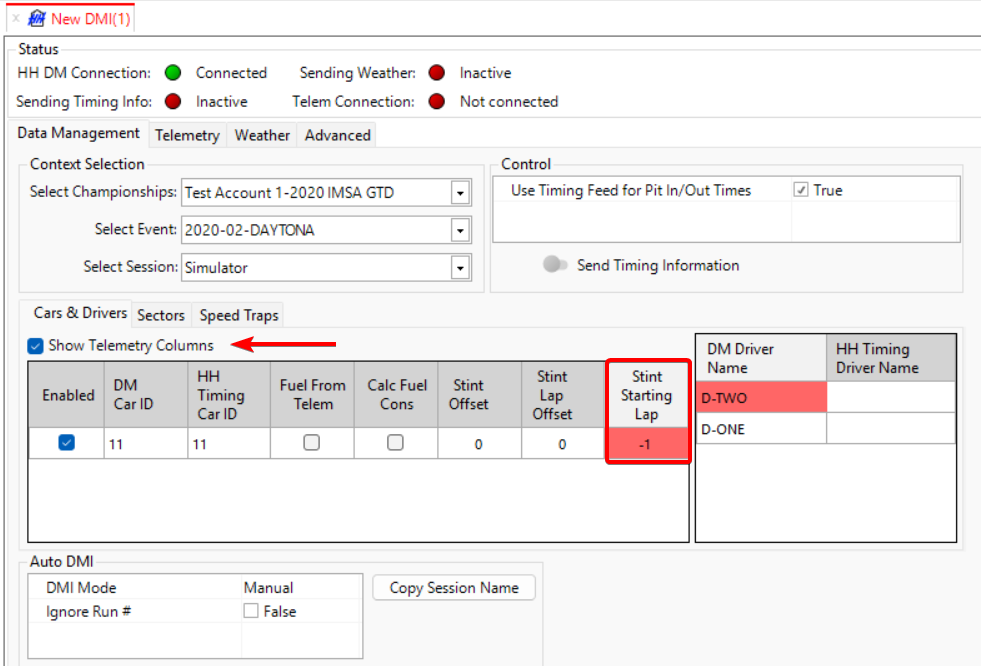 Use the DMI telemetry mode to import data when a timing feed is unavailable. This mode utilizes telemetry lap times and parameters to populate the runsheet automatically via the RT Reader.