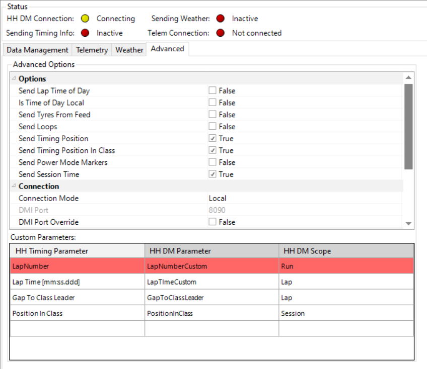 - Send Timing Position In Class: Same as Send Timing Position just that it sends the position in class. The value is stored in the parameter TimingPositionInClass of type Double in the SessionCarData definition. If the parameter doesn't exist in HH Data Management it gets ignored.
