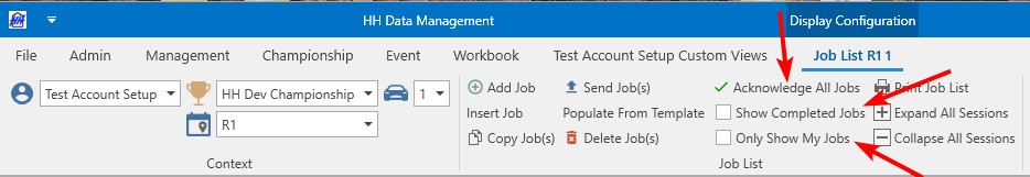 Buttons are available to show or hide the completed jobs and to acknowledge all jobs or to show only jobs that are assigned to the current user.