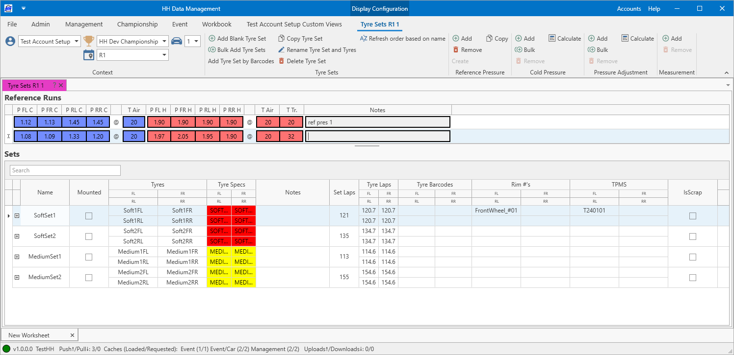 Once the tyres and set are created, the tyres also become available in the event tyres view. Individual tyres can also be created in bulk without being associated to a set using the Bulk Add Tyres function.