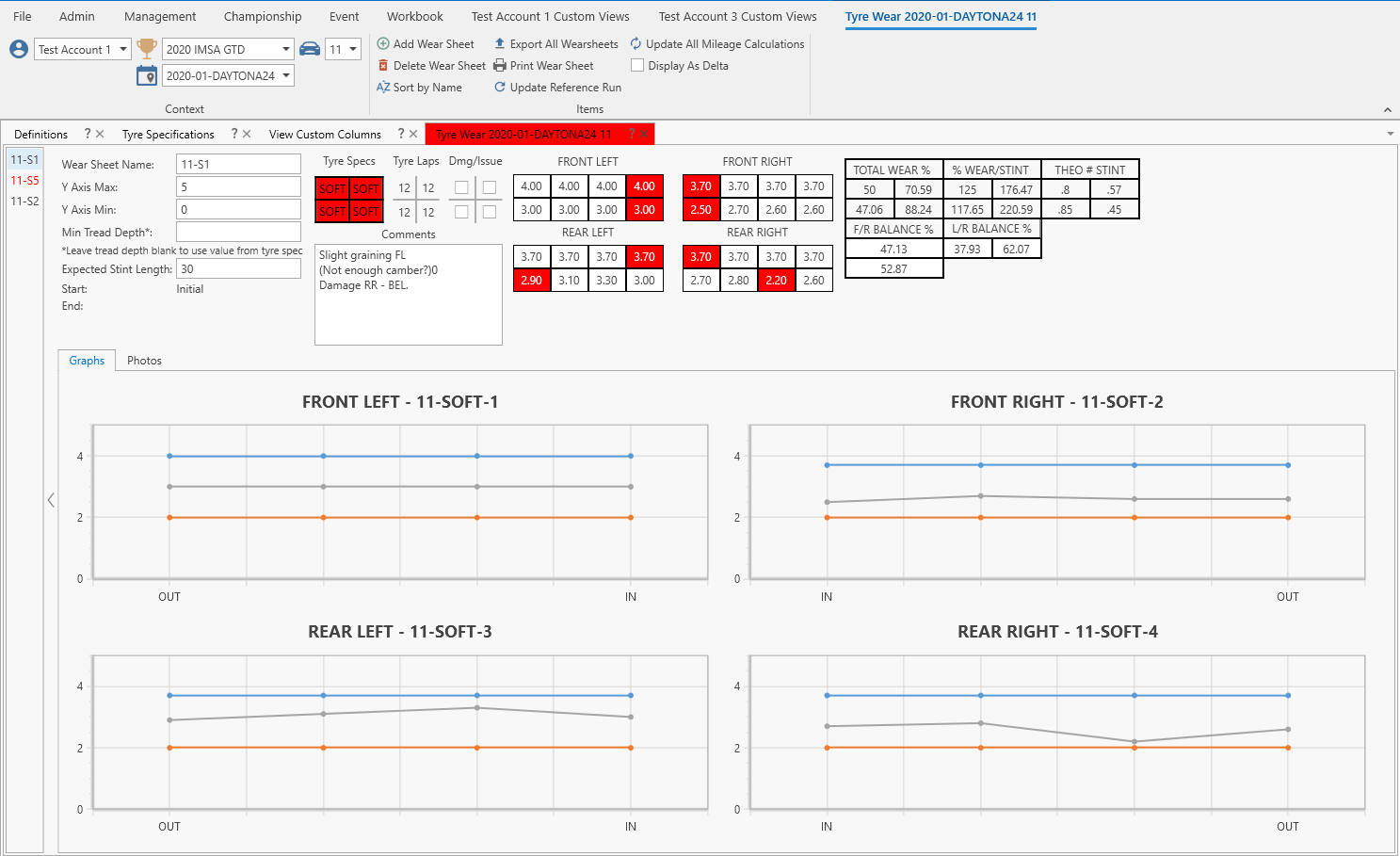 The Tyre Wear Comparison view allows the user to compare wear between tyre sets and can be accessed from the event tab of the ribbon bar: