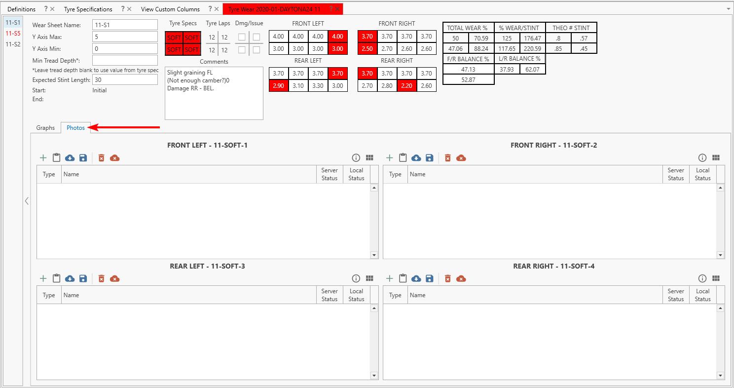 Files can be attached to tyre wear sheets by clicking on the photos tab. The tab has four attached file views that allow photos (or other types of files) to be attached and linked to each tyre in the wear sheet.