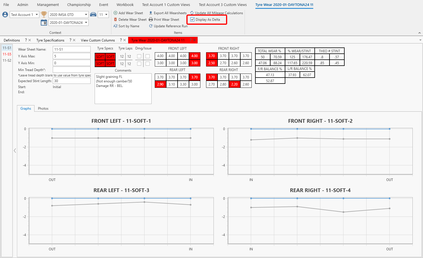 Tyre wear can be viewed as a delta comparison that assumes the initial measurement as a zero'd baseline. This will more easily identify uneven wear characteristics on a tyre.