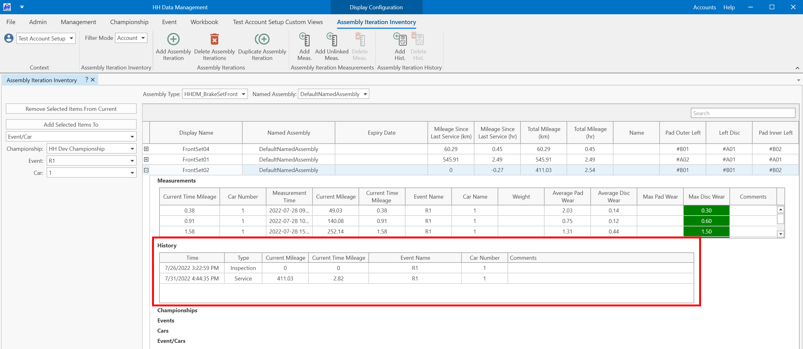 This allows last run that the part item or assembly iteration was used in to be defined and this will be used to calculate the mileage for the measurement. The downloaded mileage is used to calculate the mileage of the component before the current event, and then the local data from the runsheets and laps are used to calculate the mileage that has been accrued in the current event.
