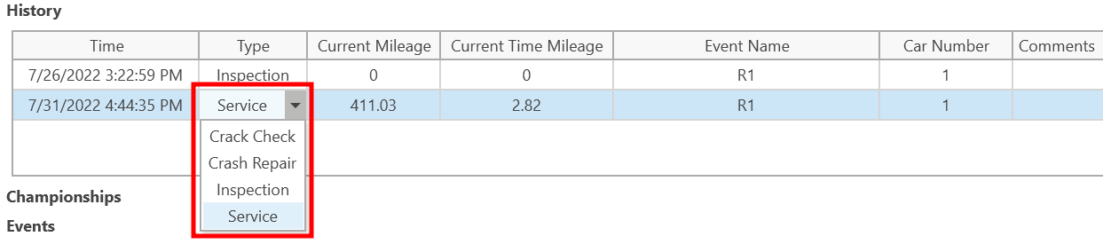 When creating a history item, a context selection wizard is presented to select the last run in which the assembly iteration was used. This is used to calculate the mileage for the history item. The downloaded mileage is used to calculate the mileage of the component before the current event, and then the local data from the runsheets and laps are used to calculate the mileage that has been accrued in the current event.