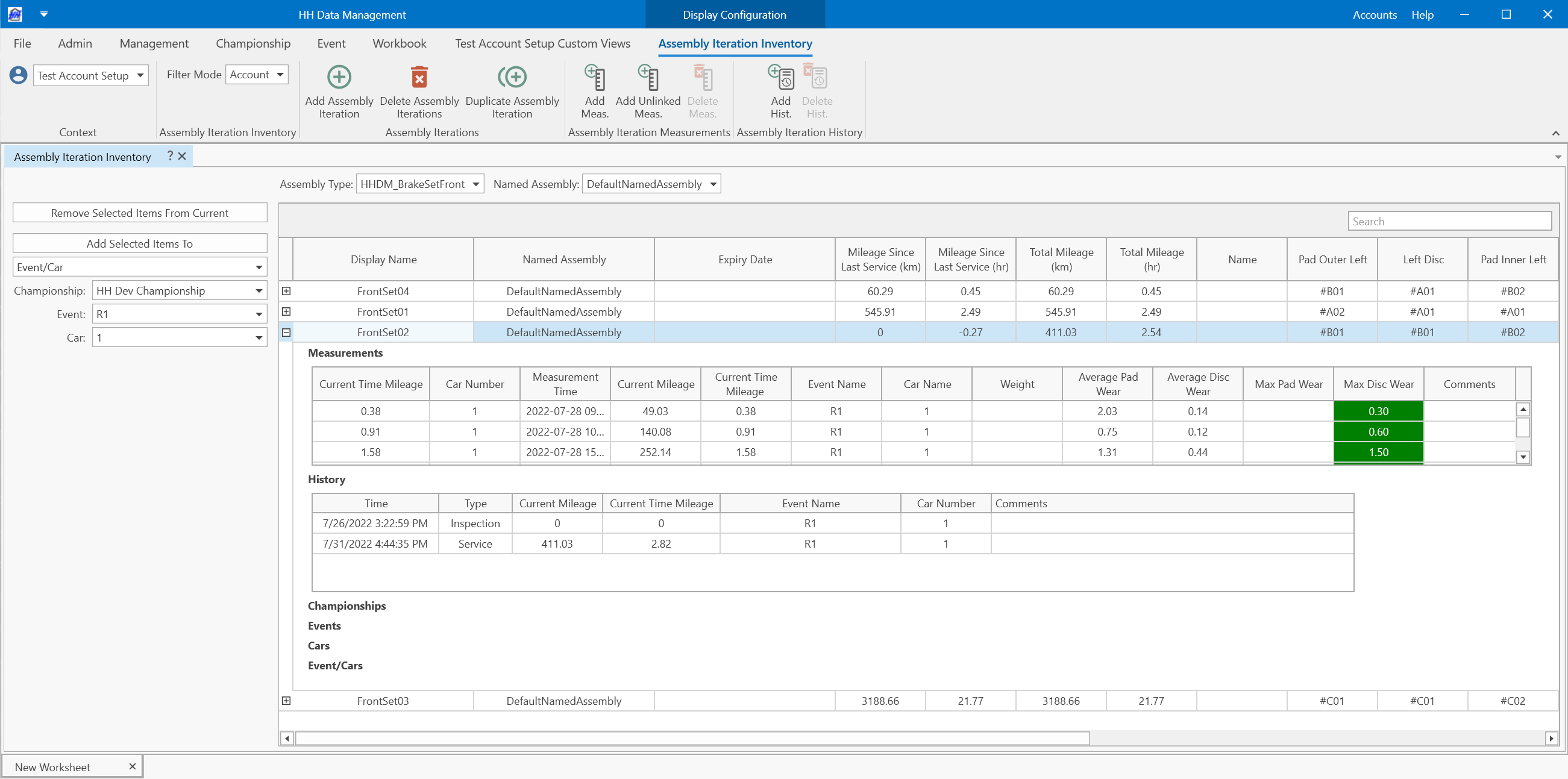 - Assembly Iteration: represents a physical, assembled assembly. In the brake set example, the assembly iteration would have the specific calipers, pads, and discs used to create the assembly iteration that was used on the car. An assembly iteration can be built using other assembly iterations or part items. Each time the part items or sub-assemblies in an assembly are changed a new iteration needs to be created. This allows a complete history of the assembly to be kept which is important for calculating mileages on past events.