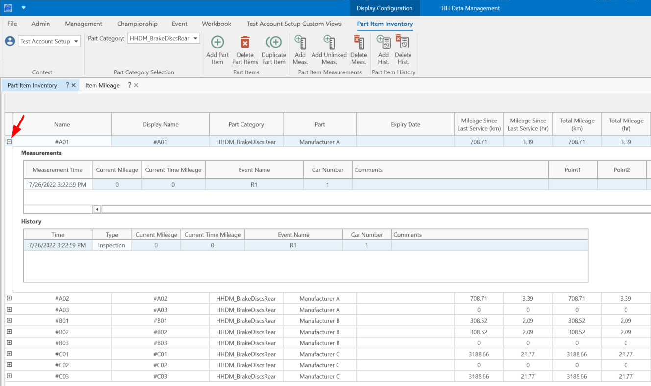All part items of the selected part category are displayed in a table. The measurements and history items of each part item can be viewed and edited by expanding the row: