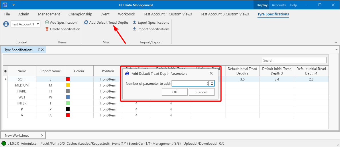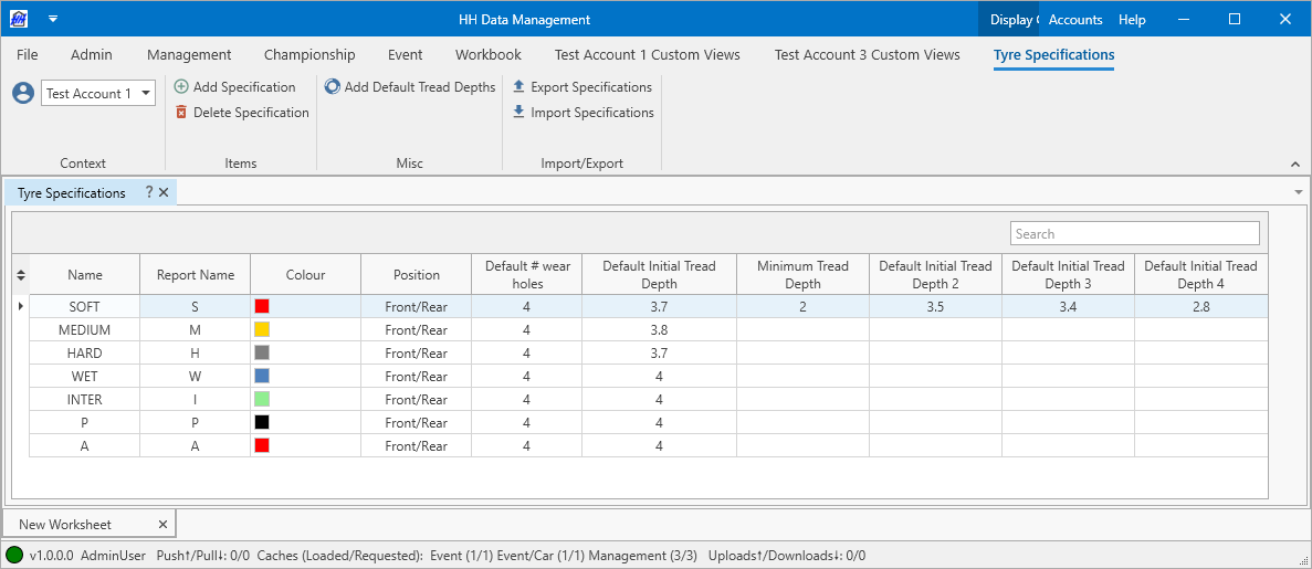Each tyre must have a specification when it is created and after this it cannot be changed. The tyre specifications view can be opened from the admin tab of the ribbon bar: